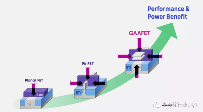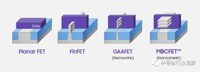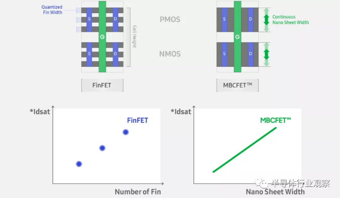 據(jù)介紹,有兩種類型的GAAFET:典型的GAAFET,這被稱為具有“薄”鰭的納米線。以及MBCFET,稱為具有“厚”鰭的納米片。在兩種情況下,柵極材料在所有側(cè)面上都圍繞溝道區(qū)。納米線和納米片的實(shí)際實(shí)現(xiàn)方式在很大程度上取決于設(shè)計(jì),因此,一般而言,許多行業(yè)觀察家用術(shù)語GAAFET來描述兩者。但是以前它們被稱為環(huán)繞柵晶體管(surrounding-gate transistors :SGT)。值得一提的是,MBCFET是 三星的 商標(biāo)。