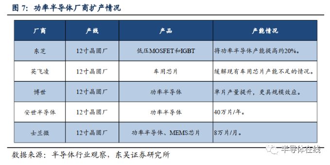 目前,功率半導(dǎo)體廠商已陸續(xù)開(kāi)啟擴(kuò)產(chǎn),且擴(kuò)產(chǎn)形式多為興建12寸晶圓廠。根據(jù)半導(dǎo)體行業(yè)觀察的報(bào)道,2021年3月10日,東芝宣布計(jì)劃引進(jìn)一條新的12英寸晶圓生產(chǎn)線,以提高低壓MOSFET和IGBT的生產(chǎn)能力,預(yù)計(jì)新廠將于2023年上半年投產(chǎn),屆時(shí)有望將功率半導(dǎo)體產(chǎn)能提高約20%。該公司表示,將根據(jù)市場(chǎng)趨勢(shì),逐步確定后續(xù)投資計(jì)劃,并將繼續(xù)擴(kuò)大日本工廠的分立器件,特別是功率半導(dǎo)體器件的生產(chǎn)。