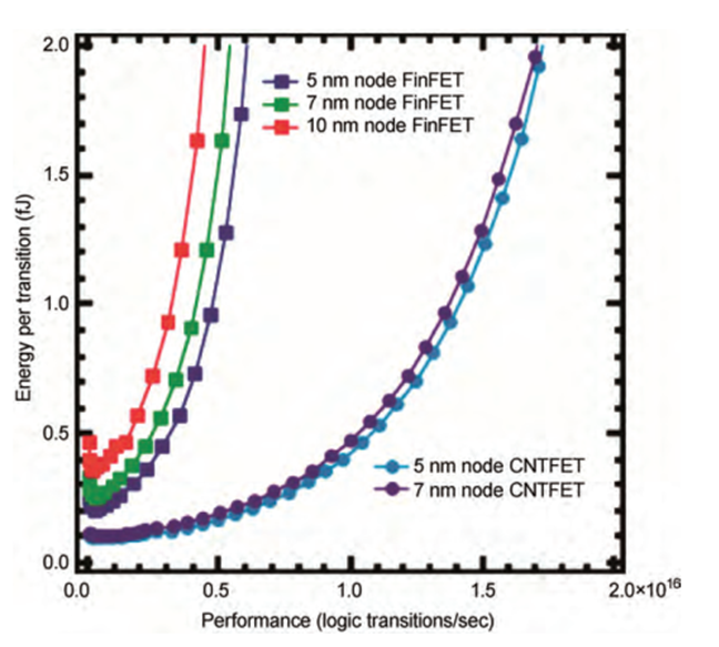 碳納米管是未來最有希望取代硅基材料的理想碳基半導(dǎo)體材料。IBM研究表明,10nm技術(shù)節(jié)點(diǎn)后碳納米管芯片在性能和功耗方面都將比硅芯片有明顯改善。從硅基7nm到5nm技術(shù),芯片速度大約提升20%,而相比硅基7nm技術(shù),碳納米管基7nm技術(shù)的芯片速度將提升300%。