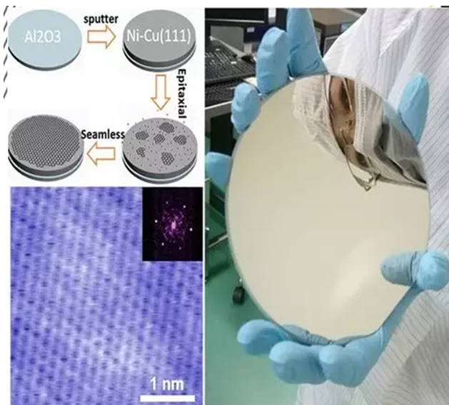 2019年,北京大學(xué)劉忠范院士與彭海琳教授聯(lián)合團(tuán)隊(duì)循著外延襯底制備-石墨烯外延生長這一研究思路,首先制備了4英寸CuNi銅鎳合金單晶薄膜,并以其為生長基底實(shí)現(xiàn)了4英寸石墨烯單晶晶圓的超快速制備。同時(shí),該團(tuán)隊(duì)研發(fā)了石墨烯單晶晶圓批量制備裝備,實(shí)現(xiàn)了單批次25片4英寸石墨烯單晶晶圓的制備,設(shè)備年產(chǎn)能可達(dá)1萬片,在世界范圍內(nèi)率先實(shí)現(xiàn)了石墨烯單晶晶圓的可規(guī)?;苽?。
