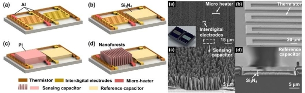 基于以上問(wèn)題,微電子所研究員陳大鵬課題組提出了一種以納米森林為濕敏材料,同時(shí)集成參比電容、微加熱器和熱敏電阻的新型濕度傳感器。納米森林具有超親水性和完全開(kāi)放的納米結(jié)構(gòu),可提高濕度傳感器靈敏度。該器件同時(shí)使用差值法消除寄生電容,通過(guò)熱敏電阻進(jìn)行溫度補(bǔ)償以提高傳感器精度,采用微加熱器進(jìn)一步縮短響應(yīng)時(shí)間。與傳統(tǒng)的聚酰亞胺濕度傳感器相比,基于納米森林的濕度傳感器在10-90%的相對(duì)濕度范圍內(nèi),靈敏度提高了15倍,響應(yīng)時(shí)間縮短至5s。此外,該傳感器還具備制作工藝簡(jiǎn)單、兼容CMOS工藝、適合批量生產(chǎn)等優(yōu)勢(shì)。