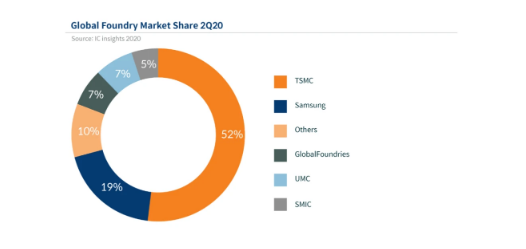 首先,臺(tái)積電在芯片產(chǎn)能方面處于行業(yè)領(lǐng)先地位,各大手機(jī)廠商都希望獲得臺(tái)積電的芯片。目前,臺(tái)積電在全球圓晶代工市場(chǎng)的份額比其后三個(gè)競爭者加起來都要多。數(shù)據(jù)顯示,2020 年第 2 季度,臺(tái)積電占全球晶圓市場(chǎng)的 52%,遠(yuǎn)高于其他芯片制造商。