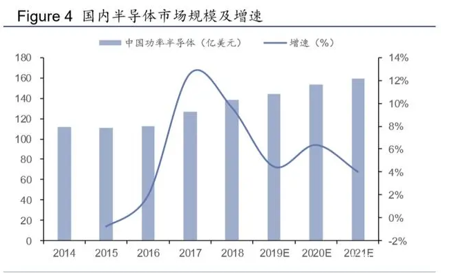 全球市場規(guī)模平穩(wěn)增長,國內(nèi)市場需求有望保持高速增長。功率半導(dǎo)體作為電子設(shè)備中最基礎(chǔ)的元器件,應(yīng)用領(lǐng)域極其廣泛。從市場規(guī)模來看,根據(jù) IHS Markit 數(shù)據(jù), 2018 年全球功率半導(dǎo)體市場規(guī)模約為 400 億美元,預(yù)計到 2021 年市場規(guī)模將增長至 441 億美元,年復(fù)合增速為 4.1%。中國是全球最大的 功率半導(dǎo)體消費市場,未來有望保持高速發(fā)展,根據(jù) IHS Markit 數(shù)據(jù),2018 年國內(nèi)市場規(guī)模達到 138 億美元,增速為 9.5%,占全球需求比例高達 35%, 預(yù)計未來中國功率半導(dǎo)體將繼續(xù)保持較高速度增長,2021 年市場規(guī)模有望達 到 159 億美元,年復(fù)合增速達 4.8%。從增量來源來看,由于下游新能源以及汽車電子化程度的提升,功率半導(dǎo)體的應(yīng)用領(lǐng)域已從工業(yè)控制和消費電子拓展至光伏、風(fēng)電、智能電網(wǎng)、變頻家電、新能源汽車等諸多市場,下游新型領(lǐng)域市場的發(fā)展情況是功率半導(dǎo)體未來增量的重要保證。