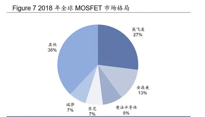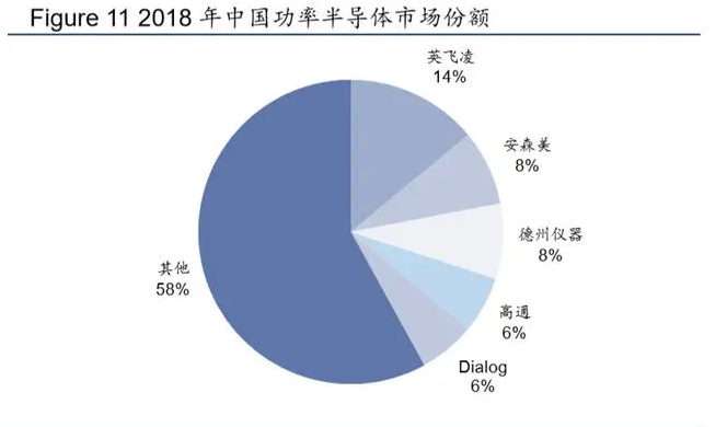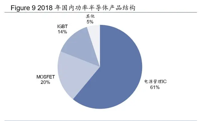在中國功率半導(dǎo)體市場,電源管理 IC、MOSFET 和 IGBT 合計占據(jù)了 95% 的市場份額。其中,電源管理 IC 市占率高達 61%,占比最大,MOSFET 和 IGBT 市場份額分別為 20%和 14%。得益于下游消費電子、新能源汽車、通 訊行業(yè)近幾年的快速發(fā)展,電源管理 IC 市場保持穩(wěn)健增長,截止 2018 年, 中國電源管理 IC 市場規(guī)模已達 84.3 億美元。同時,未來伴隨新能源汽車行 業(yè)的快速發(fā)展,MOSFET 和 IGBT 也將迎來廣闊的成長空間。