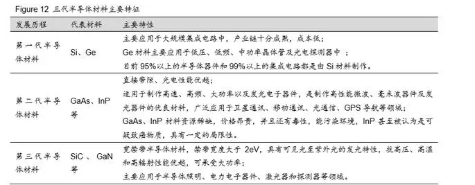 材料分子結(jié)構(gòu)導(dǎo)致先天性能優(yōu)勢。第三代半導(dǎo)體材料相對于 Si 材料具有:禁帶寬度更大、電子飽和飄移速度較高等特點,制作出的半導(dǎo)體器件擁有光電性能優(yōu)異、高速、高頻、大功率、耐高溫和高輻射等特征,具備應(yīng)用于光電器件、微波器件和電力電子器件的先天性能優(yōu)勢。