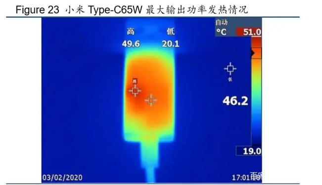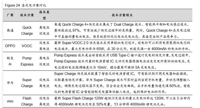 主流廠商依次跟進,高功率,小體積成最明顯優(yōu)勢。小米于 2020 年 2 月發(fā) 布了 GaN 充電器 Type-C65W,能夠為小米 10Pro 最高提供 50W 的充電功 率,小米 10Pro 搭配其使用從 0 充電至 100%僅需 45 分鐘。同時,它支持 小米疾速閃充、PD3.0 等快充協(xié)議,并且還支持全系 iPhone 快充,官方表 示,使用小米 GaN 充電器 Type-C65W 為 iPhone11 充電,充電速度比原裝 5W 充電器提升約 50%。得益于新型半導(dǎo)體材料 GaN 的加持,Type-C65W的體積比小米筆記本標配的適配器減小約 48%。此外,小米 Type-C65W 的 USB-C 接口支持多個檔位的智能調(diào)節(jié)輸出電流,能為新款 MacBookPro、小 米筆記本等大功率設(shè)備進行最大 65W 充電,還能兼容大多數(shù) Type-C 接口的 電子設(shè)備,包括 Switch 等。產(chǎn)品搭載 E-Marker 芯片,最大支持 5A 電流。目前,業(yè)界已推出多種快充技術(shù)方案,主要包括高通 Quick Charge 技術(shù)、 OPPO VOOC 閃充技術(shù)、聯(lián)發(fā)科 Pump Express 技術(shù)、華為 Super Charge 技術(shù)、vivo SUPER Flash Charge 技術(shù)和 USB3.1PD 充電技術(shù)等。