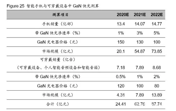 從消費電子快充市場來看,未來隨快充需求與 GaN 滲透率不斷提升,2022 年市場規(guī)模有望達到 87.74 億元。隨著 5G 手機各類參數(shù)不斷提升,內(nèi)部射頻、處理器、屏幕的耗電量在直線上升,電子產(chǎn)品對快充的需求日益提升。多家廠商發(fā)布 GaN 快充后,目前的售價大部分用戶已經(jīng)可以接受,未來滲透 率有望逐步提升。假設(shè)智能手機未來三年 GaN 快充滲透率為 1%、3%、5%, 可穿戴需求度相對手機端有所降低,三年的滲透率為 0.5%、1%、2%;我們 預(yù)計2020年全球GaN充電器市場規(guī)模為24.41億元,2022年有望達到87.74 億元。