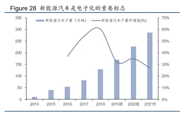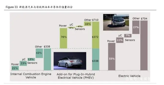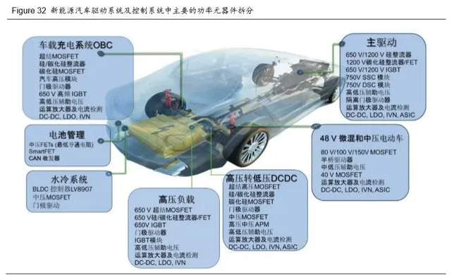 新能源汽車的電氣化占比快速提升,目前新能源汽車相比于燃油車電子零部件價值增加 5 倍以上,新增的功率半導(dǎo)體器件的性能和功率效率是電動汽車 運行的關(guān)鍵,功率元件主要用于逆變器、電源控制系統(tǒng)。