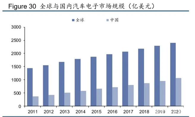汽車電子市場規(guī)??焖侔l(fā)展,國內(nèi)市場有望超千億。隨著汽車智能化、車聯(lián)網(wǎng)、安全汽車和新能源汽車時代的到來,汽車電子市場規(guī)模不斷擴大,從汽車音響空調(diào)電子顯示屏等,目前已轉(zhuǎn)向助力包括安全系統(tǒng)、娛樂信息系統(tǒng)、車內(nèi)網(wǎng)絡(luò)、動力系統(tǒng)等汽車其他相關(guān)部件發(fā)展上,未來汽車電子市場發(fā)展空間還將進一步增加,汽車電子將成為半導(dǎo)體應(yīng)用的主要增長點。根據(jù)中國汽車工業(yè)協(xié)會數(shù)據(jù),2020 年全球汽車電子產(chǎn)品市場的產(chǎn)業(yè)規(guī)模預(yù)計將達到 2400 億美元,其中我國汽車電子市場規(guī)模將超過 1058 億美元。