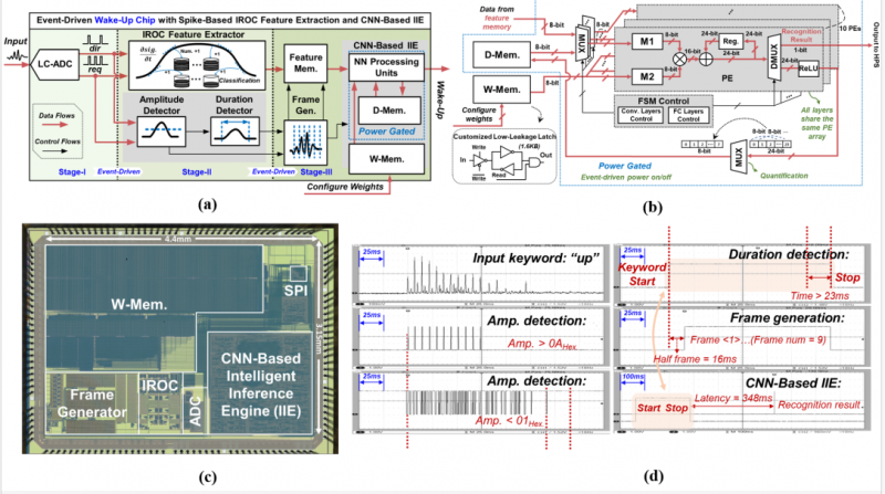 圖1. (a)異步事件驅(qū)動(dòng)型AIoT芯片架構(gòu),(b)卷積神經(jīng)網(wǎng)絡(luò)電路架構(gòu),(c)芯片顯微照片,(d)語音關(guān)鍵詞喚醒測試波形