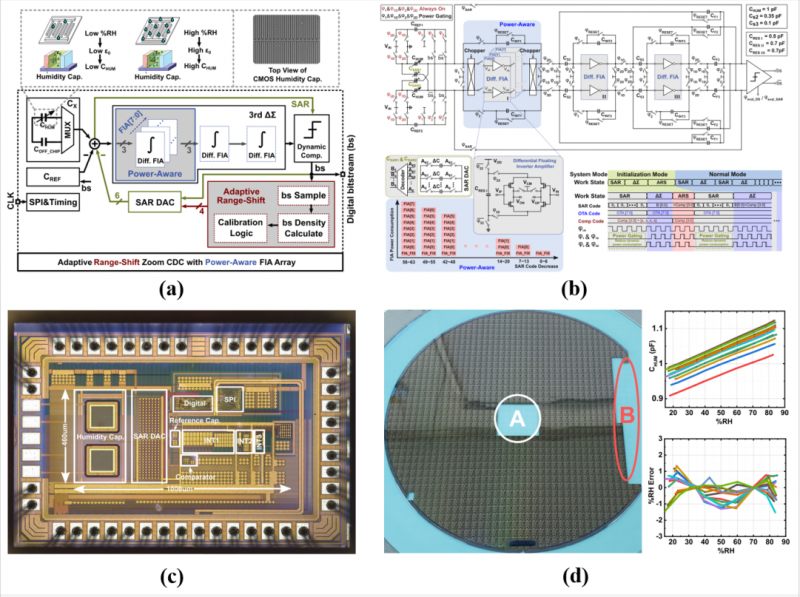 圖2. (a)動(dòng)態(tài)電荷域電容傳感芯片架構(gòu)圖, (b)電路原理圖及工作時(shí)序圖, (c)芯片顯微照片,(d)晶圓不同位置處的芯片、濕度及其誤差測試曲線
