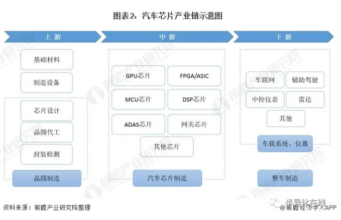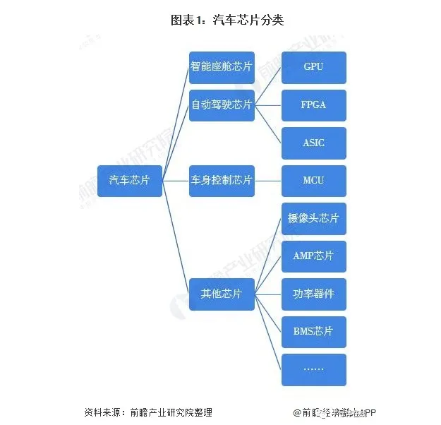 中游一般指汽車芯片制造環(huán)節(jié),包括智能駕駛芯片制造(GPU芯片、FPGA芯片、ASIC芯片),輔助駕駛系統(tǒng)芯片制造(ADAS芯片)、車身控制芯片制造(MCU芯片)等;