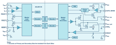 ADuM4135采用16引腳寬體SOIC封裝,包含米勒箝位,以便柵極電壓低于2 V時實(shí)現(xiàn)穩(wěn)健的SiC/GaN MOS或IGBT單軌電源關(guān)斷。輸出側(cè)可以由單電源或雙電源供電。去飽和檢測電路集成在ADuM4135上,提供高壓短路開關(guān)工作保護(hù)。去飽和保護(hù)包含降低噪聲干擾的功能,比如在開關(guān)動作之后提供300 ns的屏蔽時間,用來屏蔽初始導(dǎo)通時產(chǎn)生的電壓尖峰。內(nèi)部500 μA電流源有助于降低整體器件數(shù)量,如需提高抗噪水平,內(nèi)部消隱開關(guān)也支持使用外部電流源??紤]到IGBT通用閾值水平,副邊UVLO設(shè)置為11 V。ADI公司iCoupler芯片級變壓器還提供芯片高壓側(cè)與低壓側(cè)之間的控制信息隔離通信。芯片狀態(tài)信息可從專用輸出讀取。當(dāng)器件副邊出現(xiàn)故障時,可以在原邊對復(fù)位操作進(jìn)行控制。