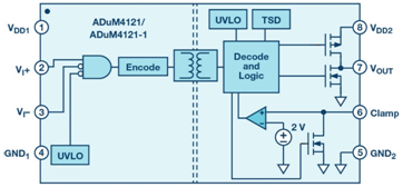 對于更加緊湊和更簡單的拓?fù)浣Y(jié)構(gòu)(例如,基于GaN的半橋),新型ADuM4121隔離式柵極驅(qū)動器是最佳解決方案。該解決方案同樣基于ADI iCoupler數(shù)字隔離技術(shù),其傳播延遲僅為38 ns,為同類最低水平,可支持最高開關(guān)頻率。ADuM4121提供5 kV rms隔離,采用窄體8引腳SOIC封裝。