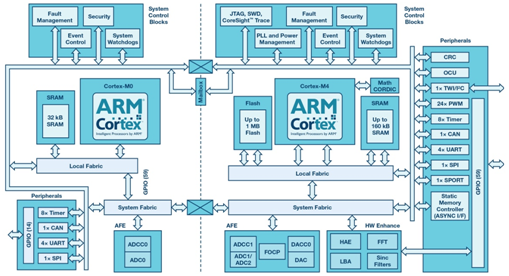 系統(tǒng)控制單元(一般是MCU、DSP或FPGA的組合)必須能并行運(yùn)行多個高速控制環(huán)路,還要能管理安全特性。它們必須提供冗余性以及大量獨(dú)立的PWM信號、ADC和I/O。ADI的ADSP-CM419F使設(shè)計(jì)師可以用一個混合信號雙核處理器同時管理高功率、高密度、混合開關(guān)、多層功率轉(zhuǎn)換系統(tǒng)。