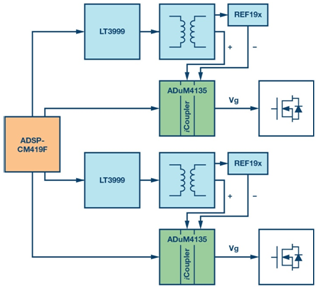在圖9中,我們可以看到功率開關(guān)驅(qū)動器中的主要元件,從產(chǎn)生正柵極電壓電平的LT3999DC-DC變壓器驅(qū)動器,到產(chǎn)生負(fù)柵極電壓電平的REF19x(或LT1121x)高效線性穩(wěn)壓器,再到ADuM4135隔離式柵極驅(qū)動器。主控制器用ADSP-CM419F處理器表示,可以嵌入電路板,也可連接高頻線纜并為隔離式柵極驅(qū)動器生成PWM信號。