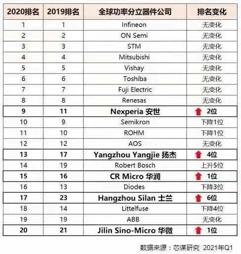 在新興應用需求及政策的支持推動下,國內功率器件近年來發(fā)展也是相當迅速,據(jù)芯謀研究統(tǒng)計,中國企業(yè)有5家進入全球前20名,其中安世半導體更是進入前十,位居第九。