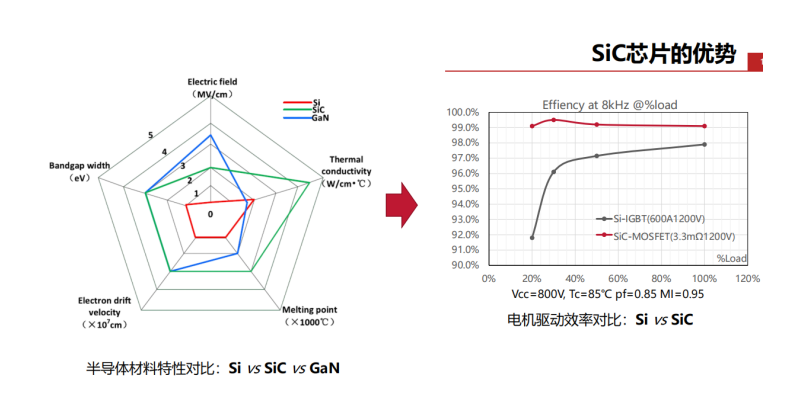 對于SiC模塊在電驅(qū)上的應用,報告指出與IGBT相比,在中小電流下,SiC MOS的導通損耗更低;SiC MOS的 開關損耗也低,反向恢復電流非常小,在極限工況下開關損耗相比IGBT低60%;在更適合城市的輕載工況下,SiC MOS損耗性能優(yōu)勢明顯,因此逆變器應用SiC MOS體現(xiàn)在效率Map上就是高效區(qū)面積比較大。