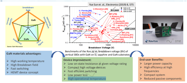 GaN具有高臨界磁場(chǎng)、高電子飽和速度與極高的電子遷移率的特點(diǎn),器件具有給定電壓額定值下的低通狀態(tài)電阻、緊湊型高壓裝置、快速高效切換、低功耗、高工作溫度等優(yōu)勢(shì)。
