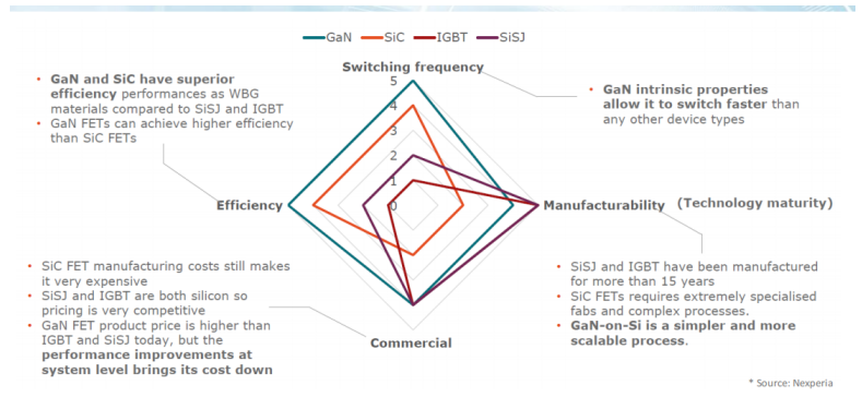 GaN在高壓應(yīng)用中相比SiC、IGBT、SiSJ在效率、開關(guān)頻率等維度具有自己的優(yōu)勢(shì)。