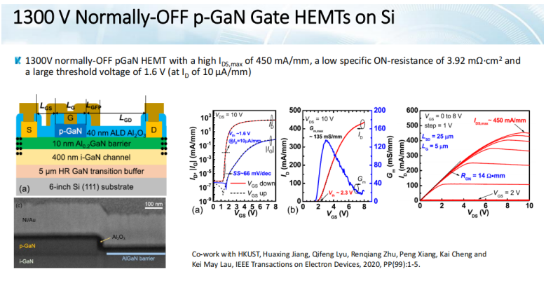 報(bào)告中,結(jié)合具體的數(shù)據(jù),陳宇超詳細(xì)分享了晶湛半導(dǎo)體的高壓、大電流路線圖,以及硅上1300伏常關(guān)p-GaN柵HEMTs,硅側(cè)SBD上的3.4kV GaN等內(nèi)容。
