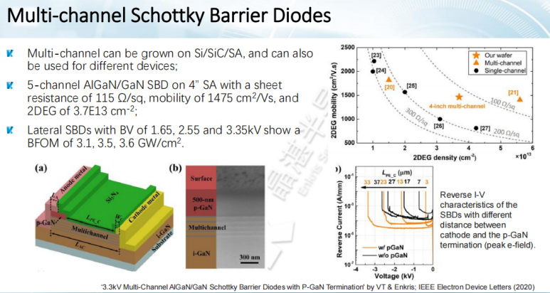 會(huì)上,蘇州晶湛半導(dǎo)體科技有限公司的市場(chǎng)經(jīng)理陳宇超帶來了“應(yīng)用于功率器件的硅基GaN外延片進(jìn)展”的主題報(bào)告,結(jié)合具體的數(shù)據(jù)分享了650V應(yīng)用的D模和E模硅基GaN外延片的進(jìn)展,并介紹了面向更高電壓/電流應(yīng)用的多通道器件研究進(jìn)展。