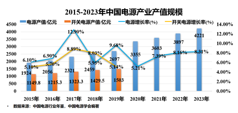 數(shù)據(jù)顯示,2019年,開關(guān)電源年市場(chǎng)容量達(dá)1503億元,年平均增長(zhǎng)率>6.5%,市場(chǎng)容量龐大、穩(wěn)定,前景廣闊。高效率、超輕薄、高度集成化、數(shù)字化是未來(lái)電源領(lǐng)域發(fā)展大趨勢(shì)。與“新基建” 接軌,適應(yīng)未來(lái)標(biāo)準(zhǔn)。
