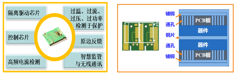 定制GaN基模塊,利用3D布局減小尺寸50%以上,減小寄生參數(shù),如雜散電感由傳統(tǒng)的數(shù)十nH減小至1nH左右。