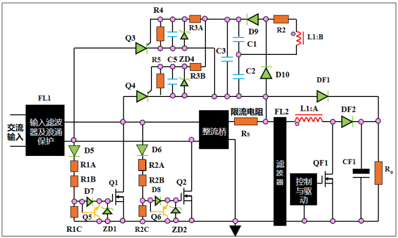工頻無(wú)橋整流電路,器件驅(qū)動(dòng)同步取自市電輸入,控制簡(jiǎn)易,無(wú)須芯片與第三方供電,EMI問題小,10A輸入時(shí)損耗可由34W下降至12W。