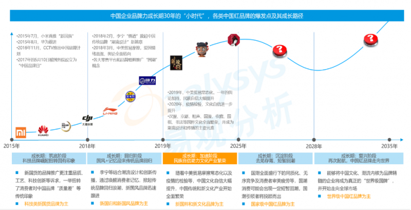 2015年,科技消費品牌率先崛起,改觀了國人對國產(chǎn)品牌的印象,中國企業(yè)品牌力開始進入至關(guān)重要的成長期。成長期內(nèi),不同類型的“中國紅”品牌依次爆發(fā)推動國潮的全面復(fù)興。以品牌內(nèi)涵與文化契合程度為縱軸,以設(shè)計的個性化程度為橫軸,將國潮“中國紅”品牌進行二維矩陣細分:由此,得到了國潮“中國紅”品牌的五大類:新國歸、新國風(fēng)、新國貨、新國粹、新文化品牌。從2015年到2035年,這20年的成長期里,各類“中國紅”品牌將依次爆發(fā)推動國潮消費全面復(fù)興。