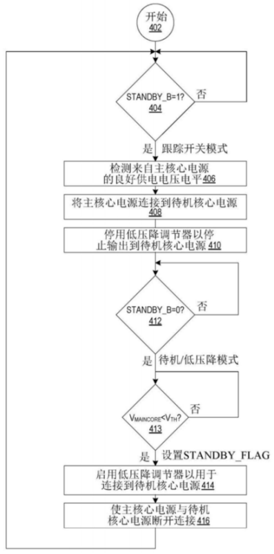 如上圖,為該專利中發(fā)明的用于低功率、雙核心微控制器的自適應(yīng)待機(jī)電源的簡(jiǎn)化電路圖,待機(jī)電源100包括第一開(kāi)關(guān)電源101-104和第二LDO電源114-115,兩種電源連接在一起為汽車供電,其中也包括微控制器的主核心和待機(jī)核心。為了實(shí)現(xiàn)供電的目的,在LDO線性電壓調(diào)節(jié)器110上設(shè)置有負(fù)載開(kāi)關(guān)116,連接在MCU的供電引腳上,通過(guò)互補(bǔ)的方式停用或者啟用負(fù)載開(kāi)關(guān)。