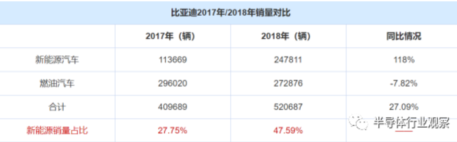當(dāng)前,比亞迪的新能源汽車業(yè)務(wù)已經(jīng)和燃油車業(yè)務(wù)達(dá)到了平分秋色的地步。根據(jù)比亞迪官方近期發(fā)布的銷售統(tǒng)計(jì)數(shù)據(jù)顯示,在比亞迪2018全年累計(jì)銷售的52.07萬輛車中,其中新能源汽車為24.78萬輛,燃油車為27.29萬輛。比亞迪新能源汽車占比從2017年的27.75%提升至2018年的47.59%。