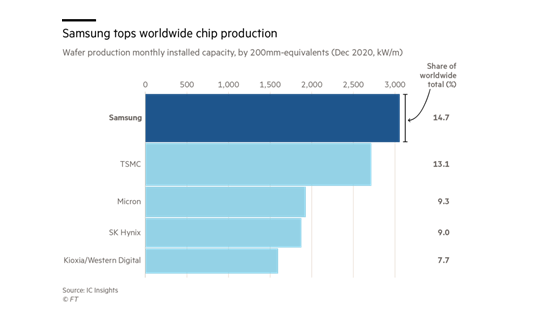 2020年底,三星芯片產(chǎn)能占全球的15%,這使得該公司領(lǐng)先臺(tái)積電和存儲(chǔ)芯片競(jìng)爭對(duì)手美光科技。