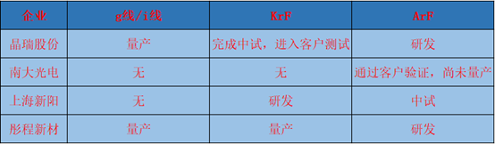 其中,在國(guó)產(chǎn)半導(dǎo)體光刻膠廠商中,彤程新材控股子公司北京科華、晶瑞股份都已經(jīng)量產(chǎn)g線/i線光刻膠,上海新陽(yáng)投建的干法ArF光刻膠尚無(wú)實(shí)質(zhì)進(jìn)展,南大光電的ArF光刻膠已通過(guò)某一客戶認(rèn)證,晶瑞股份KrF光刻膠已經(jīng)完成中試,正進(jìn)入客戶測(cè)試階段,而彤程新材(北京科華)KrF光刻膠項(xiàng)目早已通過(guò)“國(guó)家02”專項(xiàng)驗(yàn)收,并從在去年就已經(jīng)開始大量導(dǎo)入國(guó)內(nèi)多家晶圓廠。