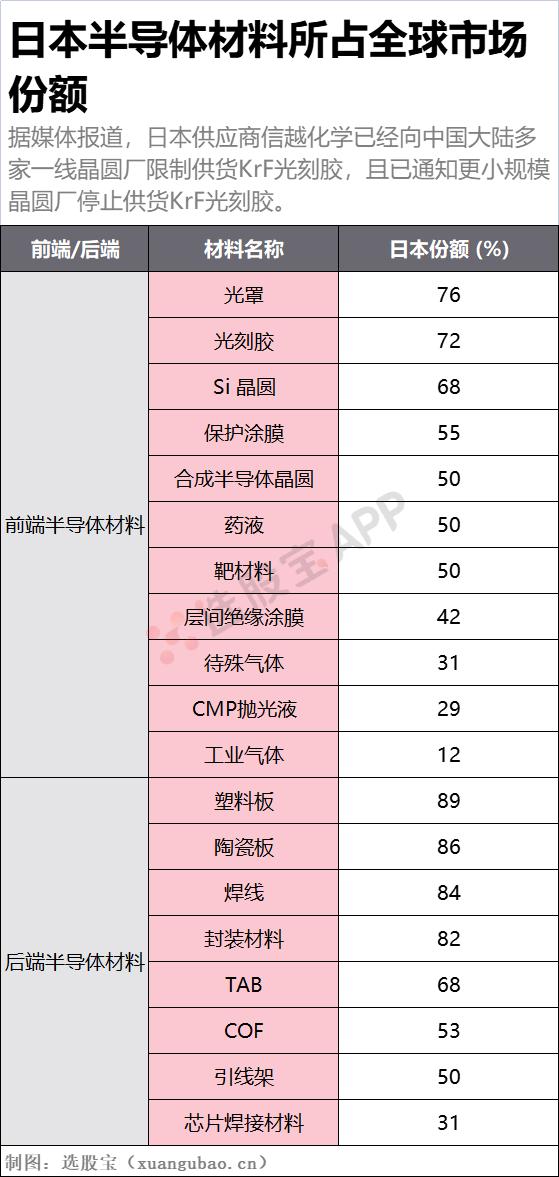 生產(chǎn)半導體芯片需要 19 種必須的材料,缺一不可,且大多數(shù)材料具備極高的技術(shù)壁壘;而日本企業(yè)在硅晶圓、合成半導體晶圓、光罩、光刻膠、藥業(yè)、靶材料、保護涂膜、引線架、陶瓷板、塑料板、 TAB、 COF、焊線、封裝材料等 14 中重要材料方面均占有 50%及以上的份額。