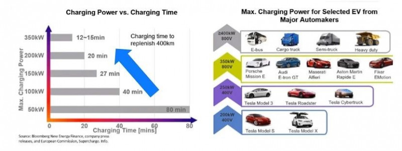 特斯拉汽車的 400 V “超級(jí)充電站” (Supercharger) 網(wǎng)絡(luò)掀起了這一潮流,但這還不足以實(shí)現(xiàn) 15 分鐘充電的目標(biāo)。因此,導(dǎo)入電壓高達(dá) 800 V 的架構(gòu)發(fā)展便成為重要的趨勢 (圖1)。