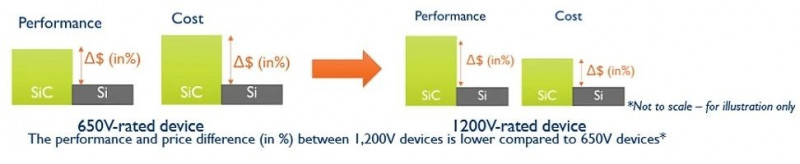 圖2. 新的 800 V 架構(gòu)需要將器件額定電壓從 650 V 轉(zhuǎn)變成 1200 V,這會(huì)進(jìn)一步拉大 Si 和 SiC 之間的性能差距,同時(shí)降低兩者之間的成本差異。(來源:Yole Développement)