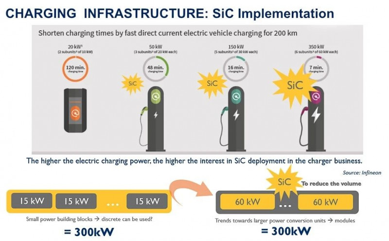 圖1. 縮短充電時(shí)間的需求,帶動(dòng)直流快速充電機(jī)功率性能的提升。(來源:Yole Développement, Power SiC Materials, Devices and Applications 2020)