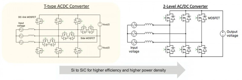 SiC 只有極低甚至沒有反向恢復(fù)電流,并且能夠以比 Si 高三到五倍的頻率進(jìn)行開關(guān),從而減小了電容器和磁性元件的尺寸和重量。