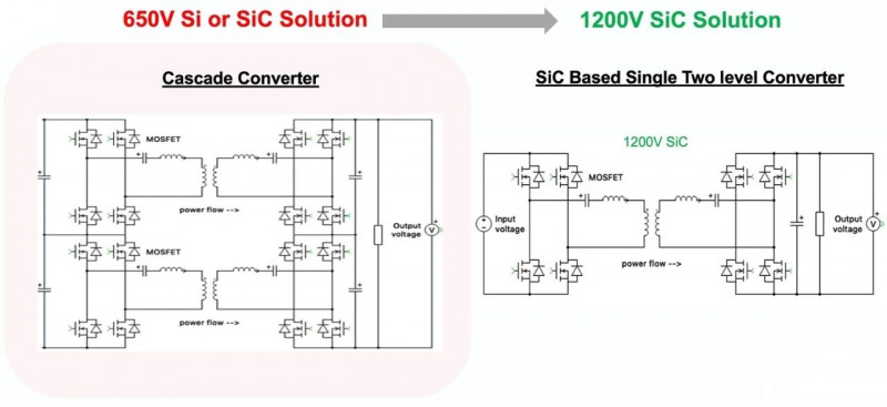 圖7. 級(jí)聯(lián)變換器 (左) 的開關(guān)頻率范圍為 80 - 120 kHz,并且需要更多數(shù)量的開關(guān)和柵極驅(qū)動(dòng)器。1200 V SiC 拓?fù)?(右) 則更為精簡,開關(guān)頻率范圍為 140 - 250 kHz,且僅需更少數(shù)量的部件。