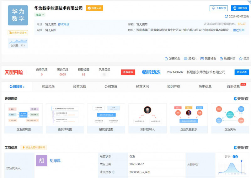 據(jù)天眼查消息,今日,華為數(shù)字能源技術(shù)有限公司成立,法定代表人為胡厚崑,注冊資本30億人民幣。該公司由華為技術(shù)有限公司出資30億全額控股。