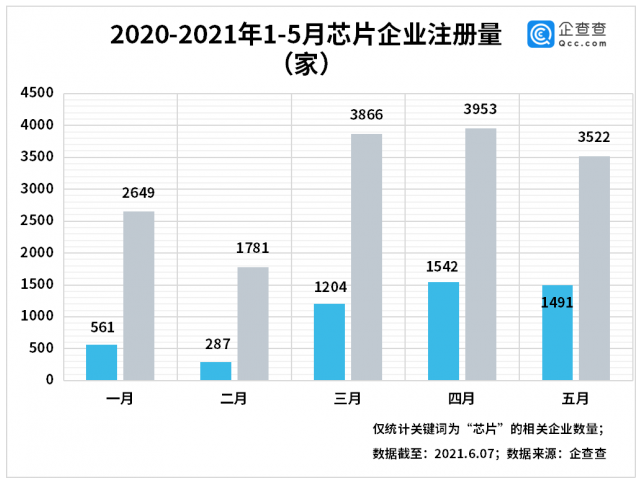 企查查數(shù)據(jù)顯示,我國共有關(guān)鍵詞為“芯片”的在業(yè)存續(xù)企業(yè)6.70萬家。2011年以來的十年之間,芯片企業(yè)注冊(cè)量呈逐年增長趨勢(shì),2011年共注冊(cè)芯片企業(yè)1180家,到了2020年,芯片企業(yè)注冊(cè)量呈井噴式增長,共2.17萬家,同比增長216%。2021年截至5月底共注冊(cè)芯片企業(yè)1.57萬家,同比增長230%,芯片行業(yè)仍然呈現(xiàn)高速增長趨勢(shì)。\
