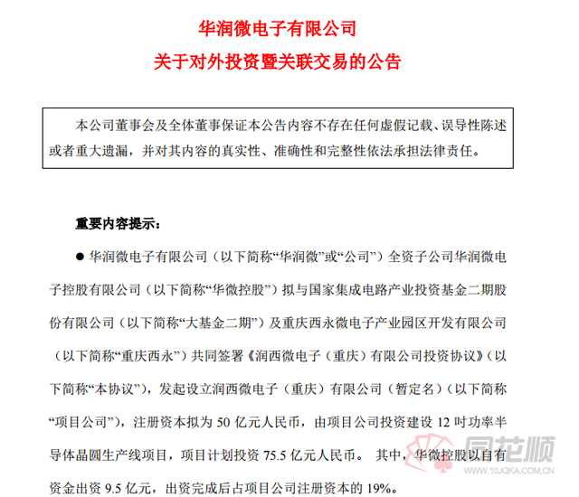 6月7日晚,華潤(rùn)微公告稱(chēng),旗下全資子公司華微控股擬與國(guó)家集成電路產(chǎn)業(yè)投資基金二期股份有限公司(簡(jiǎn)稱(chēng)“國(guó)家大基金二期”)和重慶西永微電子產(chǎn)業(yè)園區(qū)開(kāi)發(fā)有限公司(簡(jiǎn)稱(chēng)“重慶西永”)發(fā)起設(shè)立一項(xiàng)目公司,注冊(cè)資本擬為50億元,由項(xiàng)目公司投資建設(shè)12英寸功率半導(dǎo)體晶圓生產(chǎn)線項(xiàng)目,項(xiàng)目計(jì)劃投資75.5億元。