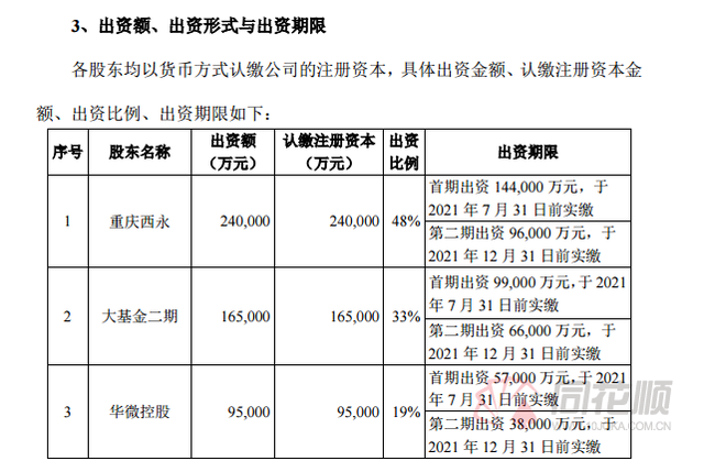 根據(jù)公告,重慶西永、國(guó)家大基金二期、華微控股分別出資24億元、16.5億元、9.5億元,出資完成后分別占項(xiàng)目公司注冊(cè)資本的48%、33%和19%。