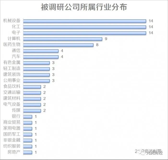 統(tǒng)計顯示,機構調(diào)研的96家公司,屬于創(chuàng)業(yè)板的有23家,科創(chuàng)板企業(yè)15家,另外58家來自主板,主板占比超過60%。從行業(yè)分布來看,機械設備、化工、電子最受機構青睞,均有14家公司獲調(diào)研。