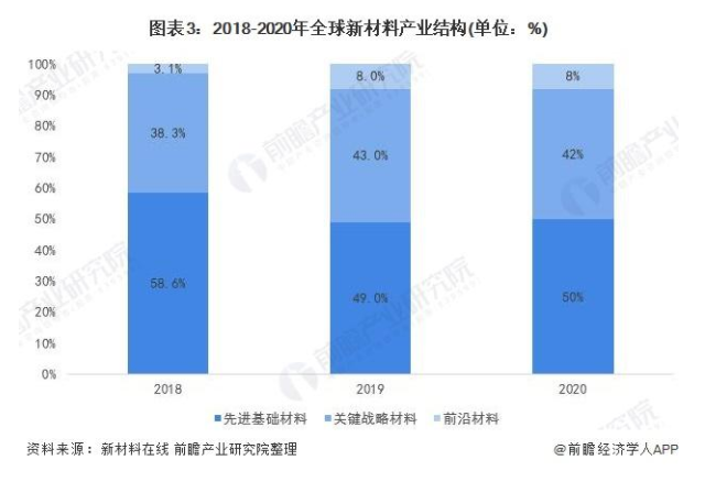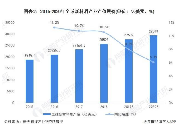 2018-2019年數(shù)據(jù)為新材料在線的測算數(shù)據(jù),2020年數(shù)據(jù)為前瞻根據(jù)全球新材料產業(yè)往年及當年情況進行的測算。