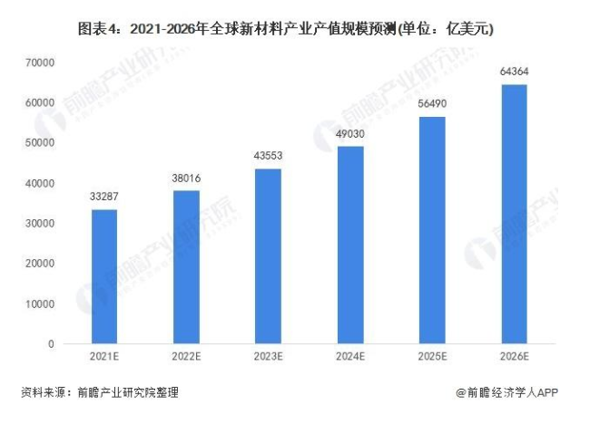 在全球工業(yè)4.0的大背景下,航空航天、電氣電子、醫(yī)療器械、汽車等工業(yè)發(fā)展將會進入到一個新的發(fā)展階段,對新材料的需求將會增長。此外,伴隨著越來越多的國家加大力度對新材料進行研究與開發(fā),未來全球新材料的技術將會得到進一步的發(fā)展,這也將反向推動全球各行各業(yè)對新材料的需求。前瞻預測,未來五年全球新材料產業(yè)產值規(guī)模將保持正增長態(tài)勢,2026年有望突破6萬億美元。