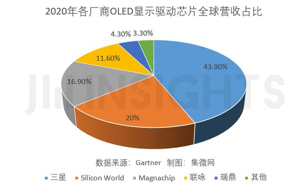 但是韓國OLED產(chǎn)業(yè)仍然主導(dǎo)全球市場,帶動韓國OLED驅(qū)動芯片市場繁榮。根據(jù)Gartner數(shù)據(jù),2020年韓國OLED顯示驅(qū)動芯片設(shè)計(jì)廠商三星、Silicon World、Magnachip全球營收占比近80%。