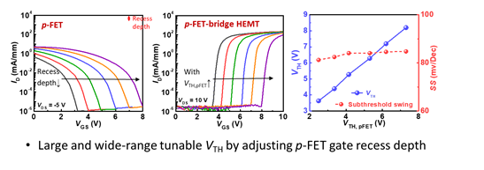 根據(jù)該思路,南科大制備了一種新型氮化鎵功率晶體管,成功將器件的閾值從1.7V提升到3.2-8.4V范圍內(nèi),可據(jù)需求自由調(diào)節(jié),并實(shí)現(xiàn)了較高的閾值穩(wěn)定性。