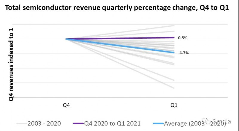 2021年第一季度的半導(dǎo)體收入比上一季度即2020年第四季度有所增長(zhǎng),這是自研究機(jī)構(gòu)Omdia從2002年開始追蹤半導(dǎo)體季度收入以來(lái)第三次出現(xiàn)這種情況。